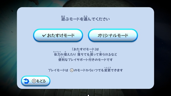 このモードを選択すると体力が倍増するほか、落ちても元の場所に戻してくれたり、水中でもメーターが減らなくなります。