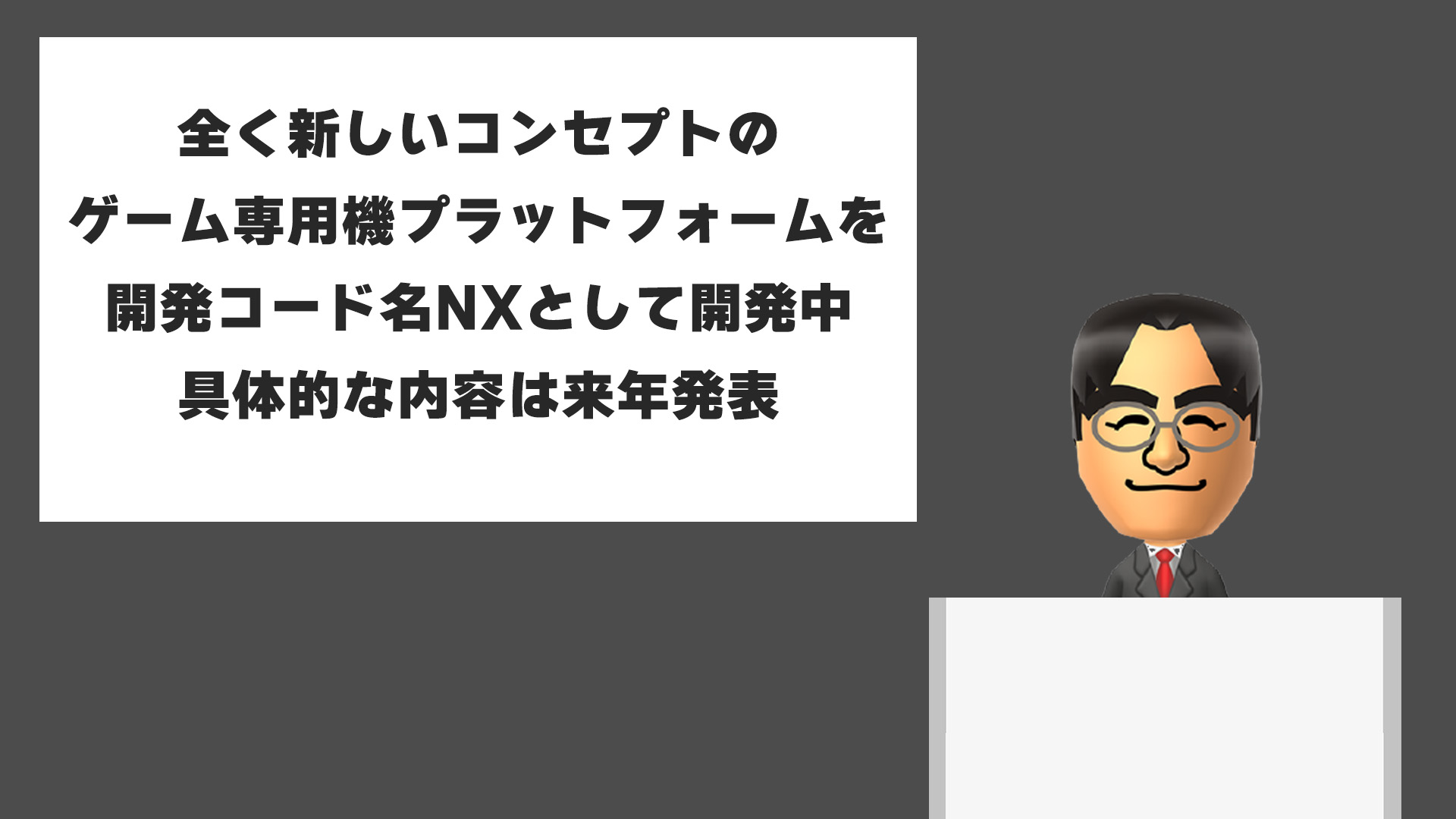 当時はWii Uが発売されて2年ちょっとしか経っていなかったので、新型ゲーム機を発表するにはあまりにも早いタイミングでした。