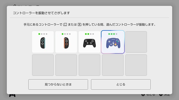 その後にコントローラーを逆さまにして、「コントローラー」→「コントローラーをさがす」からゲームキューブコントローラーのアイコンを選択します。