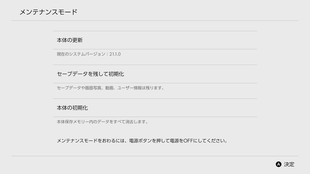 そちらには本体の更新セーブデータを残して初期化本体の初期化が表示されます。